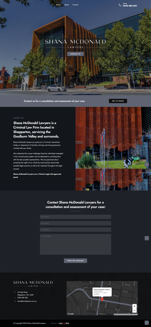 Mad Web Skills also provided photography of the landmark Shepparton Law Courts building to infuse the website with a sense of place and purpose. The result? A website that seamlessly combines simplicity, elegance, and professionalism, mirroring the essence of Shana McDonald Lawyers' practice